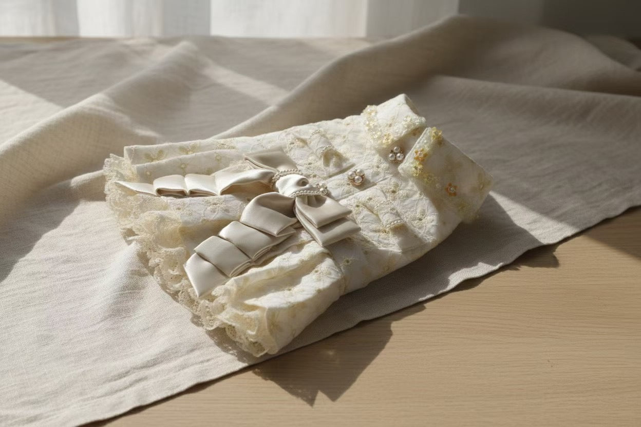 The Elsamilu Elegant Tweed Pet Dress with Pearl Bow is designed for small dogs and cats, blending luxurious tweed fabric with a graceful pearl-accented bow. Perfect for holiday gatherings, parties, and stylish winter walks.