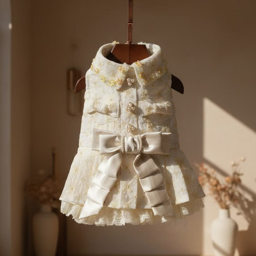 Elsamilu Elegant Tweed Pet Dress with Pearl Bow – Classic Winter Outfit for Small Dogs & Cats